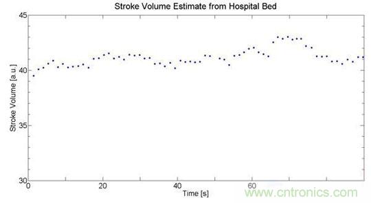 通過先進(jìn)的濾波算法,可以從病床的諧振與噪聲中分離出心搏圖數(shù)據(jù),如圖4估算出的心率和搏量,其中的血搏量是不帶單位的數(shù)據(jù),它需要進(jìn)行標(biāo)定才能等到一個(gè)絕對(duì)值。圖4中的搏量變異性估算得相當(dāng)準(zhǔn)確,它可以用于估算呼吸率。