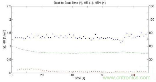 圖4中的點(diǎn)與點(diǎn)之間的時(shí)間就是心臟跳動(dòng)的時(shí)間,心率及心率變異性可以從中計(jì)算出來,如圖5。村田的工程師也在電子稱上使用SCA61T測(cè)量出相同的心搏圖數(shù)據(jù),當(dāng)然,在電子稱上因?yàn)槿说倪\(yùn)動(dòng),噪聲更大,如圖六。