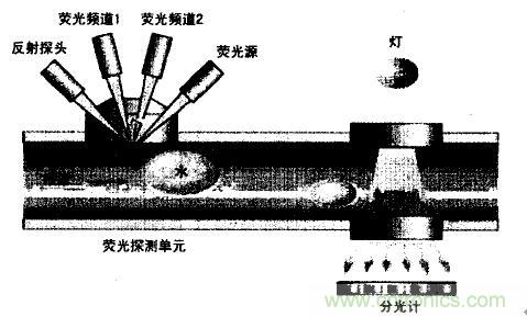 發(fā)光頻率為f的激光經(jīng)透鏡,光纖被送到表皮組織。對(duì)于不動(dòng)的組織,例如血管壁,所反射的光不產(chǎn)生頻移;而對(duì)于皮層毛細(xì)血管里流速為 的紅細(xì)胞,反射光要產(chǎn)生頻移,其頻率變化為△f;發(fā)生頻移的反射光強(qiáng)度與紅細(xì)胞的濃度成比例,頻率的變化值可與紅細(xì)胞的運(yùn)動(dòng)速度成正比。發(fā)射光經(jīng)光纖收集后,先在光檢測(cè)器上進(jìn)行混頻,然后進(jìn)人信號(hào)處理儀,從而得到紅細(xì)胞的運(yùn)動(dòng)速度和濃度。