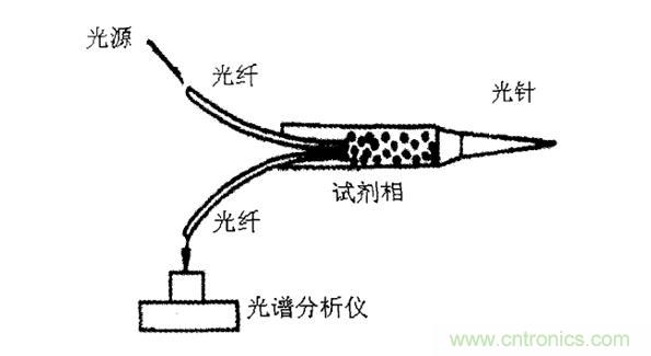 用來測(cè)定活體組織和血液值pH光纖光譜傳感器示意圖,如圖5所示。其工作原理是利用發(fā)射光、透射光的強(qiáng)度隨波長的分布光譜來進(jìn)行測(cè)量。這種傳感器將兩根光纖插入可透過離子的纖維素膜盒中.膜盒內(nèi)裝有試劑,當(dāng)把針頭插入組織或血管后,體液滲入試劑,導(dǎo)致試劑吸收某種波長的光。用光譜分析儀測(cè)出此種變化,即可求得血液或組織的pH值。