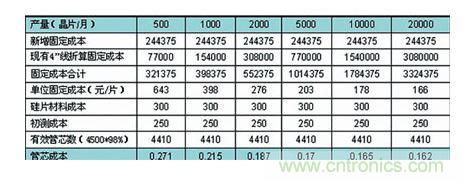4”圓晶片生產(chǎn)線生產(chǎn)MEMS壓力傳感器Die成本估計(jì)如表所示,新增固定成本是指為該項(xiàng)目投入的人員成本和新設(shè)備的折舊(人員:專家1名+MEMS設(shè)計(jì)師2名+工程師4名+工藝師5名+技工12名,年成本147萬元,新增設(shè)備投入650萬元,按90%四年折舊計(jì)算);現(xiàn)有4”線成本是指在5次光刻條件下使用4”線的成本(包括人工、化劑、水電、備件等的均攤成本);硅片材料成本是指雙拋4寸硅片的價(jià)格。