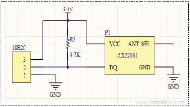 溫度采集單元主要有傳感器、處理器和電源組成,傳感器18B20負(fù)責(zé)區(qū)域內(nèi)溫度信息的采集和數(shù)據(jù)轉(zhuǎn)換,將溫度的傳感器信息經(jīng)過A/D轉(zhuǎn)換,得到數(shù)字信息,供處理器AX22001進(jìn)行處理。其原理圖如圖1所示,其中ANT_SEL引腳接天線,用來傳送無線信號。