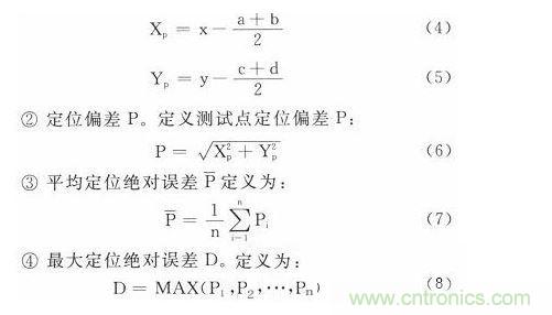 ①偏差Xp、Yp。假設(shè)在物理平臺(tái)上測(cè)試點(diǎn)的網(wǎng)格坐標(biāo)取值范圍為X∈[a,b],Y∈[c,d](a、b、c、d為非負(fù)整數(shù),b-a=d-c=1,單位為cm)通過軟件求得的坐標(biāo)為(x,y),定義偏差Xp、Yp: