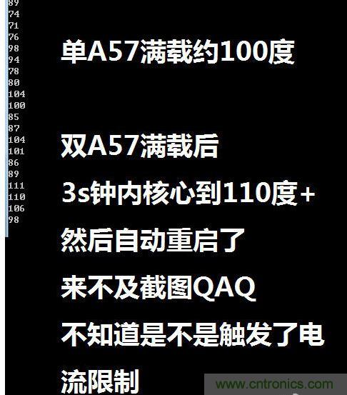 那么810的功耗有多高呢,根據(jù)貼吧大神(炮神)ioncannon的分析,在Z9 Max上,810的單核心功耗最高可以達到5W(注意是單核心!單核心!單核心! 重要的事情要說三遍),雙核A57同時滿載3S就發(fā)熱達到110攝氏度,并自動重啟了,想測試下雙核的功耗都以為爆機沒辦法測試了。