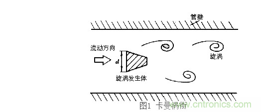 根據(jù)卡曼渦街理論(見圖一),在無限界流場中垂直插入一根無限長的非線性阻力體(即旋渦發(fā)生體C,風(fēng)速傳感器的探頭橫桿),當(dāng)風(fēng)流流經(jīng)旋渦發(fā)生體C時(shí),在漩渦發(fā)生體邊緣下游側(cè)會(huì)產(chǎn)生兩排交替的、內(nèi)旋的旋渦列(即氣流旋渦),而旋渦的產(chǎn)生頻率f正比于流速V,用公式表示如下:
