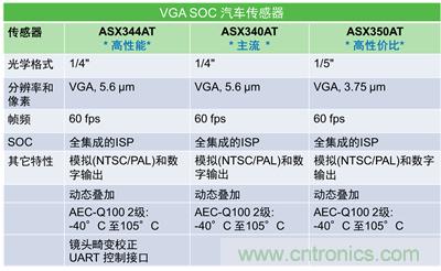 ASX344/340/350AT是用于倒車影像的系統(tǒng)級芯片(SoC),在單芯片上集成圖像信號處理器,增強的像素性能提供微光條件下的更高能見度,支持高達4層的圖像疊加以向顯示系統(tǒng)提供更多的倒車信息,支持數(shù)字縮放和平移,并附加光學中心點矯正功能,這可為客戶提供相機組裝生產(chǎn)后鏡頭中心點矯正功能,從而節(jié)省成本。這三款圖像傳感器都完全通過AEC-Q100認證,并具備-40°C至105°C的寬工作溫度范圍,它們的不同之處在于:ASX344AT還集成魚眼畸變校正功能和提供UART控制接口,定位為“高性能”的方案;ASX350AT的光學格式為1/5英寸,不同于ASX344/340AT的1/4英寸,定位為“高性價比”的方案;而ASX340AT定位為“主流”方案。設計人員可根據(jù)目標客戶的具體需求選擇有針對性的方案。