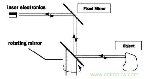 這套發(fā)射/接收組件和旋轉鏡面結合在一起,能掃描至少一個平面。鏡面不只反射二極管發(fā)出去的光,而且也能把反射回來的光再反射給接收器。通過旋轉鏡面,能夠實現(xiàn)90到180度的視角,并且大大降低系統(tǒng)設計和制造的復雜度,因為鏡面是這里面唯一的運動機構。