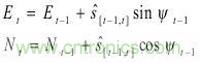 方程式2表述航位推算(DR)算法,該方法是基于步數(shù)計(jì)算,而不是加速度和角速率的積分運(yùn)算。方程式2的航位推算過(guò)程有三個(gè)要素:1)在t-1 (Et-1, Nt-1)時(shí)最后一次已知的用戶(hù)絕對(duì)位置(用東北坐標(biāo)系表示);2)從t-1到t()的步長(zhǎng);3)從時(shí)間t-1開(kāi)始的航向 (ψ) 可以算出新位置相對(duì)已知位置(Et-1, Nt-1)的坐標(biāo)(Et, Nt),如方程式2所示。