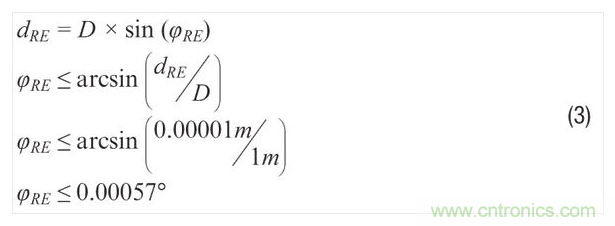 回過頭看圖2中的應(yīng)用示例,將公式1和公式2結(jié)合便可把重要標(biāo)準(zhǔn)(檢查表面上的物理失真)與MEMS陀螺儀數(shù)據(jù)手冊通常會提供的噪聲性能指標(biāo)(RND、ARW)關(guān)聯(lián)起來。在此過程中,假設(shè)公式1中的積分時間 (τ) 等于圖像捕捉時間可提供進(jìn)一步且很有用的簡化。公式3利用公式1中的一般關(guān)系來估 計,當(dāng)攝像頭距檢查表面1米 (D) 且最大容許失真誤差為10μm (dRE) 時,陀螺儀的角向誤差 (φRE) 必須小于0.00057°。