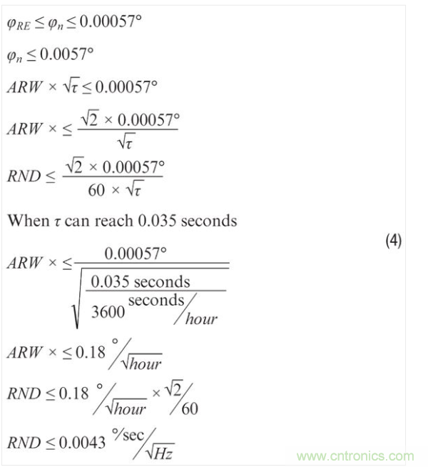 公式4將公式3的結(jié)果和公式2中的一般關(guān)系相結(jié)合,用來預(yù)測特定情況下對MEMS陀螺儀的ARW和RND要求。該過程假設(shè)圖像捕捉時間35 ms等于公式2中的積分時間 (τ),因而可以預(yù) 測,為了達(dá)到要求,陀螺儀的ARW需要小于0.18°/ hr,或者RND必須小于0.0043°/sec/ Hz。當(dāng)然,這可能不是這些參數(shù)支持的唯一要求,但這些簡單的關(guān)系提供了一個例子,告訴我們?nèi)绾螌⑵渑c已知要求和條件聯(lián)系起來。
