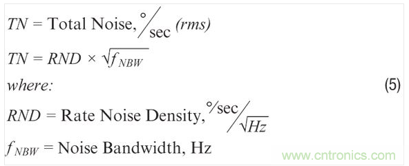 提供連續(xù)指向控制的系統(tǒng)開發(fā)者可能更愿意從角速率方面來評估噪聲影響,因?yàn)樗麄兛赡軟]有固定的積分時間來利用基于ARW的關(guān)系。從角速率方面評估噪聲常常要考慮RND參數(shù)和陀螺儀信號鏈的頻率響應(yīng)。對陀螺儀頻率響應(yīng)影響最大的常常是濾波,其支持環(huán)路穩(wěn)定標(biāo)準(zhǔn)的專用要求,并能抑制對 環(huán)境威脅(如振動)的不相干傳感器響應(yīng)。公式5給出了一種簡單方法來估算與特定頻率響應(yīng)(噪聲帶寬)和RND相關(guān)的 噪聲。