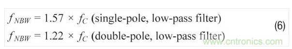 當(dāng)RND的頻率響應(yīng)遵循單極點(diǎn)或雙極點(diǎn)低通濾波器曲線時, 噪聲帶寬 (fNBW) 和濾波器截止頻率 (fC) 將有公式6的關(guān)系。