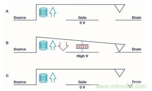 請注意,即便是在開啟位置上,開關梁仍然會有將開關往上拉動的彈簧力(藍色箭頭),但是只要向下拉動的靜電力量比較大,那么開關就會維持在開啟的狀態(tài)。 最后,當閘極電壓被移除時(圖一中的C狀況),也就是在閘極電極上0 V,靜電吸引力也會跟著消失,而開關梁會以具有足夠回復力(藍色箭頭)的彈簧而動作,開啟源極與汲極之間的鏈接,然后回返至原本的關閉位置。