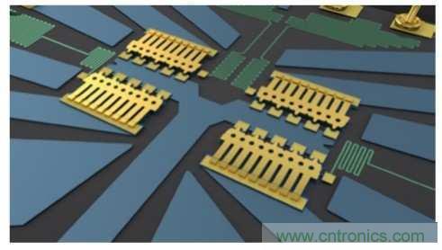圖三中所示為四組在單刀四擲(SP4T)乘法器組態(tài)設定下的MEMS開關。 每組開關梁具有五組并聯(lián)的奧姆接點,用以在開關關閉時降低電阻與提高電力的處理。