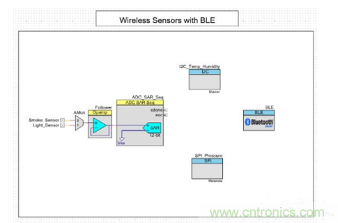 內置BLE功能的處理器的靈活性和豐富資源,使傳感器能夠與單一BLE設備連接。圖2是使用PSoC Creator的典型配置。PSoC Creator是一個用于圍繞PSoC架構開發(fā)應用程序的IDE。圖中顯示的是模擬和數字傳感器接口以及BLE子系統(tǒng)。該配置展示的是用于感測煙霧、光照強度、溫度、濕度和壓力的典型工業(yè)數據監(jiān)測系統(tǒng)。配置中的每個組件都有一個關聯的應用程序編程接口(API),開發(fā)人員可根據需要訪問這些組件。每個組件還有一個與其相關的數據表對組件的可用配置進行說明。