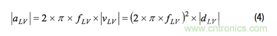 由于陀螺儀用于測量旋轉(zhuǎn)角速率,因此其對線性運(yùn)動(dòng)的響應(yīng)會(huì)引入測量誤差。MEMS IMU數(shù)據(jù)手冊通常通過“線性加速度對偏置的影響”或“線性加速度”等參數(shù)來描述對線性運(yùn)動(dòng)的這一響應(yīng),這些參數(shù)通常使用單位°/s/g。線性振動(dòng)是一種重復(fù)的慣性運(yùn)動(dòng),其幅度大小可通過位移(m)、線性速度(m/s)或線性加速度(m/s2或g)表示。在特定的振動(dòng)頻率(fLV)下,位移(|dLV|)、速度(|vLV|)和加速度(|aLV|)之間的幅度關(guān)系如公式4所示。