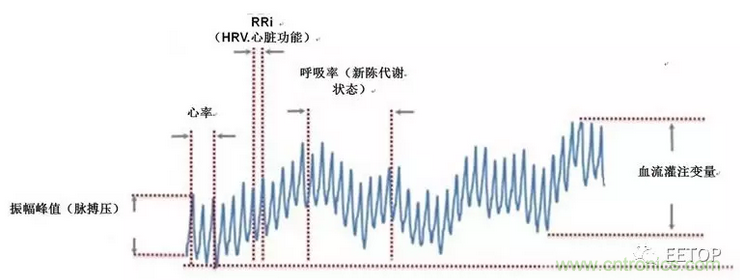 光學(xué)心率傳感器可生成測量心率的PPG波形并將該心率數(shù)據(jù)作為基礎(chǔ)生物計(jì)量值,但是利用PPG波形可以測量的對象遠(yuǎn)不止于此。盡管很難取得和維護(hù)精確的PPG測量結(jié)果(我們將在下一篇詳細(xì)論述它),但是如果您能夠成功獲得精確的PPG測量結(jié)果,它將發(fā)揮強(qiáng)大的作用。高品質(zhì)PPG信號是當(dāng)今市場需求的大量生物計(jì)量的基礎(chǔ)。圖2是經(jīng)過簡化的PPG信號,該信號代表了多個(gè)生物計(jì)量的測量結(jié)果。