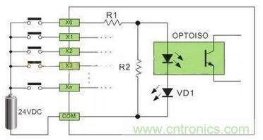 如圖1,直流輸入電路要求外部輸入信號(hào)的元件為無(wú)源的干接點(diǎn)或直流有源的無(wú)觸點(diǎn)開關(guān)接點(diǎn),當(dāng)外部輸入元件與電源正極導(dǎo)通,電流通過R1,光電耦合器內(nèi)部LED,VD1(接口指示)到COM端形成回路,光電耦合器內(nèi)部接收管接受外部元件導(dǎo)通的信號(hào),傳輸?shù)絻?nèi)部處理;這種由直流電提供電源的接口方式,叫直流輸入電路;