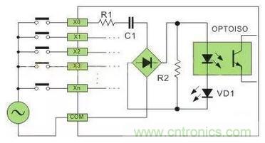 直流電可以由PLC內(nèi)部提供也可以外接直流電源提供給外部輸入信號(hào)的元件。R2在電路中的作用是旁路光電耦合器內(nèi)部LED的電流,保證光電耦合器LED不被兩線制接近開關(guān)的靜態(tài)泄漏電流導(dǎo)通。