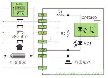 為了節(jié)省輸入端子,單端共點(diǎn)輸入的結(jié)構(gòu)是在 PLC 內(nèi)部將所有輸入電路(光電耦合器)的一端連接在一起接到標(biāo)示為 COM 的內(nèi)部公共端子,各輸入電路的另一端才接到其對(duì)應(yīng)的輸入端子 X0、X1、X2、....