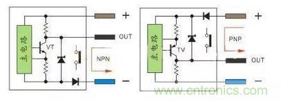 PNP型當(dāng)傳感器有檢測(cè)信號(hào)VT導(dǎo)通,正極的電流流向輸出端OUT,輸出端OUT電位接近正極,通常說的低電平翻轉(zhuǎn)成高電平。