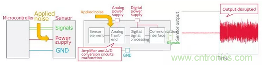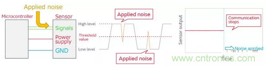 以上這樣,One chip傳感器的信號(hào)線或電源線施加噪聲時(shí),會(huì)發(fā)生通信停止或輸出值紊亂的誤操作。