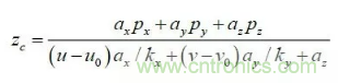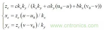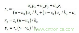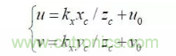 其中:(u,v)是特征點的圖像坐標,(u0,v0) 光軸中心的圖像坐標,(kx ky )是X 軸,Y 軸方向的放大系數(shù),(xc yc zc) 是特征點在攝像機坐標系下坐標, Mc 是攝像機內參數(shù)矩陣。