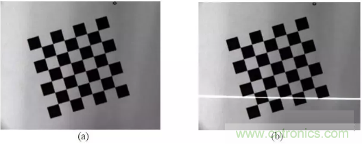 圖像的獲取是在攝機參數(shù)標定過程中同時完成。 首先將棋盤格放在工作臺上, 在這個初始位置,利用攝像機采集一幅圖,如圖 (a) 所示 。保持攝像機和棋盤格的位置姿態(tài)不變,打開激光器讓條紋投射到棋盤格上, 再采集一幅圖像如圖 (b) 所示: