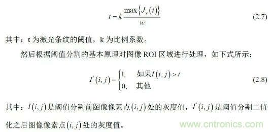 根據(jù)圖像中激光條紋的灰度值高于圖像中其它像素的灰度值以及激光條紋所在區(qū)域比較集中的特點,利用圖像ROI 內行像素灰度值之和計算激光條紋的自適應閾值: