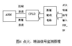 點(diǎn)火和噴油信號(hào)是汽車(chē)發(fā)動(dòng)機(jī)中的關(guān)鍵信號(hào),其周期和時(shí)序直接關(guān)系到汽車(chē)的運(yùn)行狀態(tài),因此監(jiān)測(cè)它們的周期和時(shí)序尤為重要。本系統(tǒng)監(jiān)測(cè)原理圖如圖6 所示,對(duì)于點(diǎn)火信號(hào)的監(jiān)測(cè),主要是監(jiān)測(cè)它與CPS信號(hào)的同步,以及兩個(gè)或四個(gè)點(diǎn)火信號(hào)之間的時(shí)序關(guān)系。當(dāng)CPLD尋找到點(diǎn)火信號(hào)與CPS同步的起始點(diǎn)后,根據(jù)輸入的PIP_IN信號(hào),對(duì)各點(diǎn)火信號(hào)進(jìn)行計(jì)數(shù)。每當(dāng)一個(gè)點(diǎn)火周期完成后,在下一個(gè)點(diǎn)火周期向ARM 單片機(jī)產(chǎn)生一個(gè)中斷信號(hào)。該中斷信號(hào)觸發(fā)ARM 單片機(jī)進(jìn)入中斷處理程序,在該中斷程序中,ARM單片機(jī)讀入對(duì)各點(diǎn)火信號(hào)的計(jì)數(shù)值,判斷點(diǎn)火信號(hào)的時(shí)序和周期,并設(shè)置點(diǎn)火信號(hào)正常與否的標(biāo)志。對(duì)于噴油信號(hào)的監(jiān)測(cè),主要是監(jiān)測(cè)它與CPS信號(hào)的同步,以及它們之間的時(shí)序關(guān)系。當(dāng)PIP_IN信號(hào)中四個(gè)噴油信號(hào)中任何一個(gè)信號(hào)的下降沿到來(lái)時(shí),CPLD都會(huì)監(jiān)測(cè)其它三個(gè)噴油信號(hào)的狀態(tài),如果其它三個(gè)噴油信號(hào)的狀態(tài)正常,即給出噴油信號(hào)正常標(biāo)志,反之給出噴油信號(hào)異常標(biāo)志。