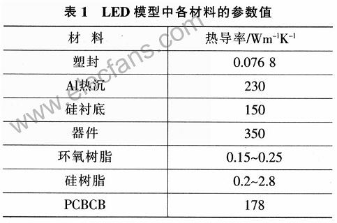 LED輸入功率為1W,光效率取10%;封裝體外部的各組件(包括MCPCB、陶瓷封裝、熱沉的外部)通過(guò)與空氣的對(duì)流散熱;器件與外界的熱對(duì)流系數(shù)為20。工作環(huán)境溫度為25℃;器件滿足使用ANSYS軟件進(jìn)行穩(wěn)態(tài)有限元熱分析的條件;最大結(jié)溫選擇為125℃。各種材料的參數(shù)如表1所示。
