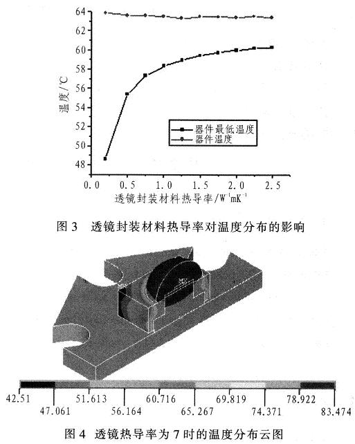 只考慮熱傳導(dǎo)與對(duì)流,改變不同封裝填充材料如硅樹(shù)脂.得出結(jié)果,如圖3所示。即使找到一種熱導(dǎo)率高達(dá)7Wm-1K-1的環(huán)氧樹(shù)脂成分封裝材料時(shí),相比使用熱導(dǎo)率為0.25Wm-1K-1的環(huán)氧樹(shù)脂成分封裝材料時(shí),芯片溫度下降不多,鋁基板溫度只下降了2.271℃,最大功率僅提高了0.69W。實(shí)際上,熱導(dǎo)率值超過(guò)7Wm-1K-1以上、可商業(yè)化的透明硅樹(shù)脂封裝材料目前尚無(wú)文獻(xiàn)報(bào)導(dǎo)。分布云圖如圖4所示。