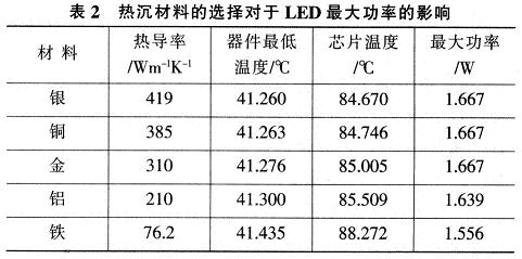 表2給出透鏡熱導(dǎo)率為0.2Wm-1K-1時(shí),不同熱沉材料的導(dǎo)熱系數(shù)對(duì)于LED最大功率影響。由表2看出,熱沉材料對(duì)于LED的最大散熱能力的影響很小。[page]