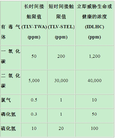 在美國(guó),國(guó)家職業(yè)安全與健康研究所(NIOSH)和美國(guó)政府工業(yè)衛(wèi)生學(xué)家會(huì)議(ACGIH)已規(guī)定了許多有毒工業(yè)氣體的短時(shí)間和長(zhǎng)時(shí)間接觸限值。"閾限值-時(shí)間加權(quán)平均值"(TLV-TWA)是指大多數(shù)工人可以在正常8小時(shí)工作日內(nèi)反復(fù)接觸而不會(huì)受到有害影響的時(shí)間加權(quán)平均濃度。"閾限值-短時(shí)間接觸限值"(TLV-STEL)是指大多數(shù)工人可以短時(shí)間接觸而不會(huì)受到刺激或傷害的濃度。"立即威脅生命或健康的濃度"(IDLHC)是一種限制性濃度,它會(huì)對(duì)生命立即或緩慢產(chǎn)生威脅,導(dǎo)致不可逆轉(zhuǎn)的健康損害,或者影響工人獨(dú)立逃生的能力。表1列出了幾種常見(jiàn)氣體的限值。