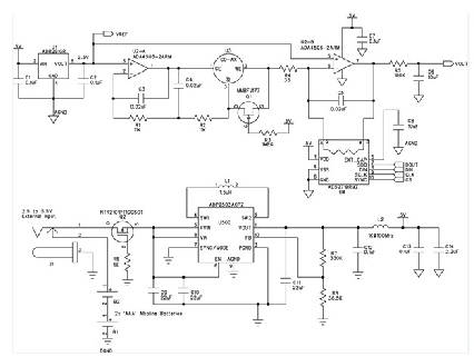 該電路由兩節(jié)AAA電池供電。使用二極管提供反向電壓保護(hù)會(huì)浪費(fèi)寶貴的電能,因此本電路使用P溝道MOSFET (Q2)。該MOSFET通過(guò)阻塞反向電壓來(lái)保護(hù)電路,施加正電壓時(shí)導(dǎo)通。MOSFET的導(dǎo)通電阻小于100 mΩ,因此它引起的壓降遠(yuǎn)小于二極管。除AAA電池以外,降壓-升壓調(diào)節(jié)器ADP2503還允許使用最高5.5 V的外部電源。在省電模式下工作時(shí),ADP2503的功耗僅38 μA.由L2、C12和C13構(gòu)成的濾波器可消除模擬電源軌產(chǎn)生的任何開(kāi)關(guān)噪聲。連接外部電源時(shí),該儀表不是通過(guò)一個(gè)電路來(lái)斷開(kāi)電池,而是利用一個(gè)插孔以機(jī)械方式斷開(kāi)電池,從而避免電能浪費(fèi)。